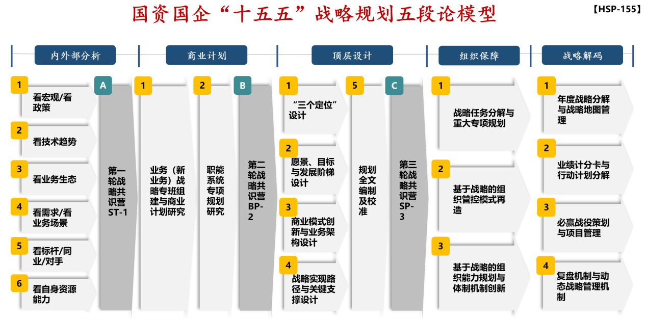 針對上述矛盾,結(jié)合本公司原創(chuàng)的國資國企十五五戰(zhàn)略規(guī)劃五段論模型(內(nèi)外部分析、商業(yè)計劃、頂層設(shè)計、組織保障、戰(zhàn)略解碼),構(gòu)建國企十五五規(guī)劃的系統(tǒng)解決方案,實現(xiàn)戰(zhàn)略引領(lǐng)、能力升級、價值創(chuàng)造的三位一體。
