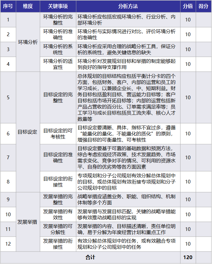 從發(fā)展環(huán)境分析、發(fā)展目標(biāo)設(shè)定、發(fā)展舉措設(shè)計三方面分析規(guī)劃制定的質(zhì)量,并細(xì)分為12個指標(biāo),每項指標(biāo)給予10分,結(jié)合具體情況進(jìn)行評價。