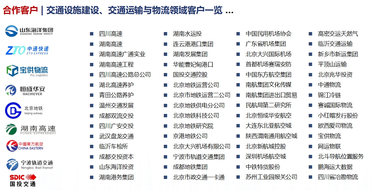(2)在公路客貨運輸方面,漢哲先后服務(wù)平頂山交運、新鄉(xiāng)交運、高密交運等客貨運綜合企業(yè),以及兆華物流(瀝青物流)、中通物流(汽車物流)等專業(yè)物流公司,以及包括北青報小紅帽物流、紅衣物流在內(nèi)的城市發(fā)行與快遞公司,以及網(wǎng)運物聯(lián)、車友寶等互聯(lián)網(wǎng)客貨運服務(wù)公司。