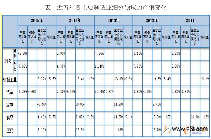 數(shù)據(jù)顯示,鋼鐵、機(jī)械工業(yè)、汽車、家電、食品、醫(yī)藥等行業(yè)2015增速均放緩,有的行業(yè)如鋼鐵、家電甚至出現(xiàn)負(fù)增長。