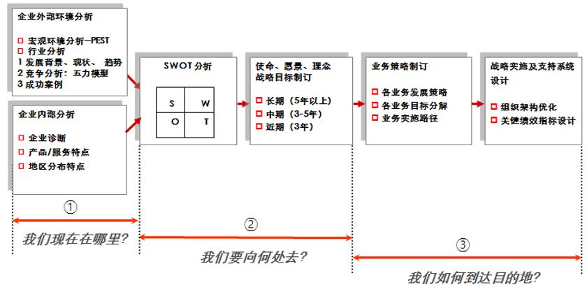 通過戰(zhàn)略規(guī)劃三階段模型、戰(zhàn)略規(guī)劃框架及 PEST、SWOT、波特五力模型、GE矩陣等工具,對企業(yè)所面臨的宏觀環(huán)境(機會與威脅)、行業(yè)現(xiàn)狀、競爭格局、發(fā)展空間及前景等進行分析,結(jié)合企業(yè)內(nèi)部資源、能力,在此基礎(chǔ)上明確公司戰(zhàn)略定位、發(fā)展目標(biāo)、業(yè)務(wù)結(jié)構(gòu)及布局、支撐措施,形成公司整體的戰(zhàn)略規(guī)劃。
