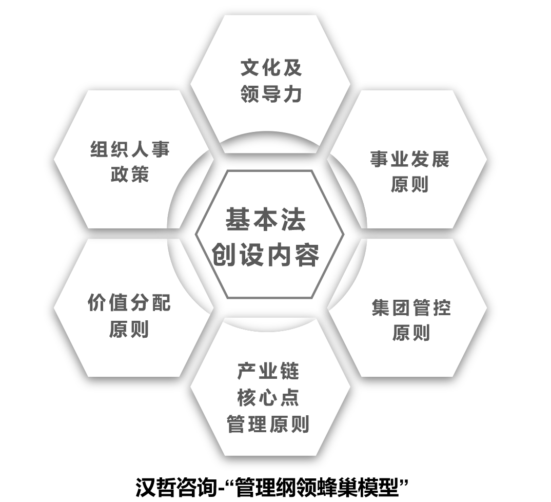 在十余年來(lái)從事企業(yè)管理大綱咨詢(xún)的過(guò)程中,漢哲創(chuàng)立了“管理綱領(lǐng)蜂巢模型”,在行業(yè)內(nèi)首家對(duì)企業(yè)管理綱領(lǐng)的內(nèi)容作出了六個(gè)維度的定義與規(guī)范。其中: