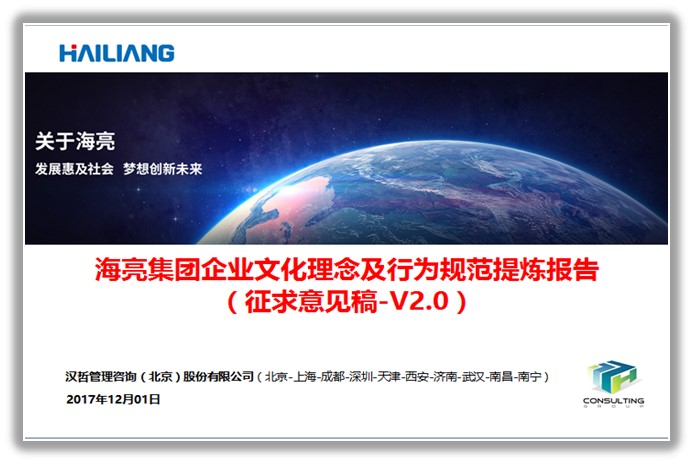 為了確保本項(xiàng)目達(dá)到新時(shí)期中國(guó)企業(yè)管理綱領(lǐng)性咨詢的新高度,漢哲咨詢集團(tuán)調(diào)集了近十位咨詢專家參與本項(xiàng)目,開(kāi)展了數(shù)千份問(wèn)卷、近五百份文件的研究,以及面向國(guó)內(nèi)外近二十家企業(yè)集團(tuán)(包括豐田、惠普、和記黃埔、復(fù)興、萬(wàn)象、比亞迪、吉利、新希望等)的綜合性研究。作為中國(guó)企業(yè)管理綱領(lǐng)類(lèi)知名咨詢作品《東風(fēng)日產(chǎn)行動(dòng)綱領(lǐng)》的起草人,漢哲咨詢首席專家段磊博士親自參與了本方案的討論和修訂工作,相信《海亮之道》將成為新時(shí)期大型綜合企業(yè)集團(tuán)戰(zhàn)略與文化轉(zhuǎn)型的標(biāo)志性作品。