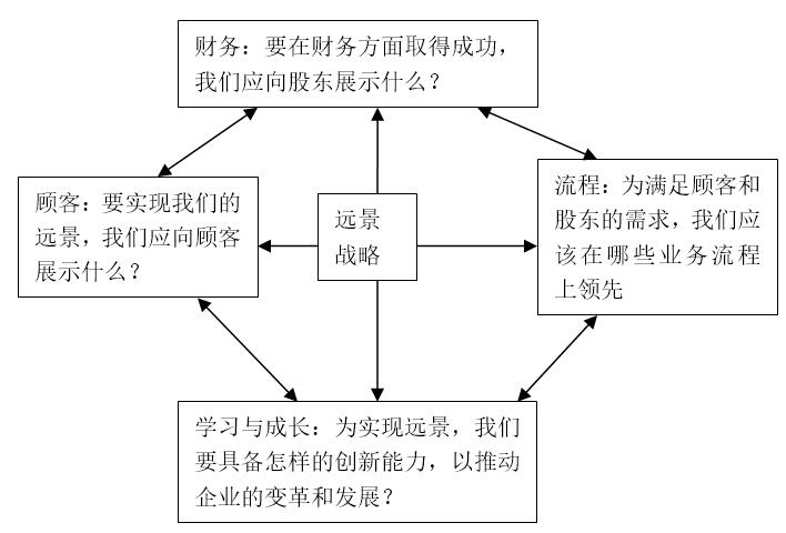 (1)以組織的共同愿景與戰(zhàn)略為核心,運用綜合與平衡的思想,依據(jù)組織結構,將公司的愿景與戰(zhàn)略轉化為下屬各責任部門在財務、客戶、內部流程、創(chuàng)新與學習等方面的系列具體目標(即成功因素),并設置相應的四張計分卡。