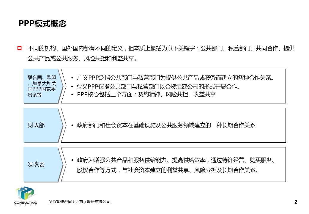 PPP模式,即政府和社會(huì)資本合作,是公共基礎(chǔ)設(shè)施中的一種項(xiàng)目運(yùn)作模式。在該模式下,鼓勵(lì)私營(yíng)企業(yè)、民營(yíng)資本與政府進(jìn)行合作,參與公共基礎(chǔ)設(shè)施的建設(shè)。不同的機(jī)構(gòu)、國(guó)外國(guó)內(nèi)都有不同的定義,但本質(zhì)上概括為以下關(guān)鍵字:公共部門、私營(yíng)部門、共同合作、提供公共產(chǎn)品或公共服務(wù)、風(fēng)險(xiǎn)共擔(dān)和利益共享。