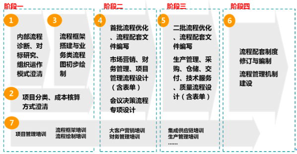 第二階段:主要為首批流程優(yōu)化、流程配套文件編寫,包含市場(chǎng)營(yíng)銷、財(cái)務(wù)管理、項(xiàng)目管理流程設(shè)計(jì)(含表單)、會(huì)議決策流程專項(xiàng)設(shè)計(jì)。
