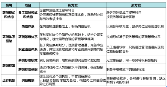 從薪酬模式和結(jié)構(gòu)、薪酬體系框架、薪酬標(biāo)準(zhǔn)、運行機制四個方面進(jìn)行新舊方案對比: