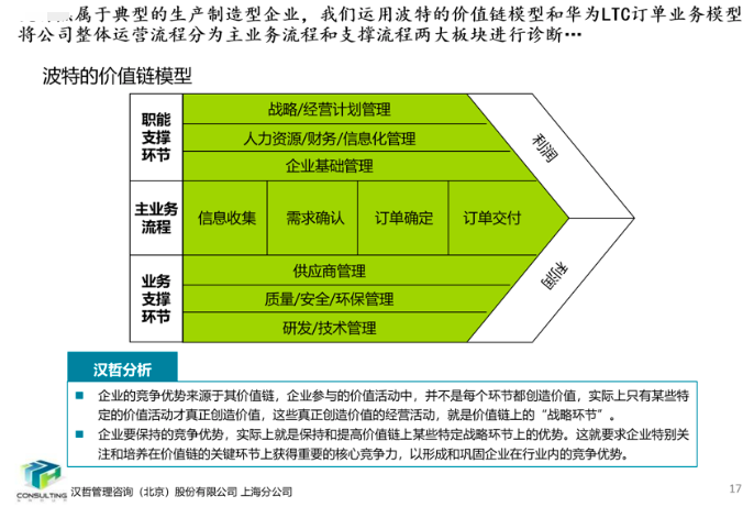 項目組針對公司在生產(chǎn)運營中凸顯的問題,應(yīng)用波特的價值鏈模型與華為的LTC訂單業(yè)務(wù)模型對公司各項業(yè)務(wù)活動進(jìn)行了分析和優(yōu)化,提出主業(yè)務(wù)流程框架及業(yè)務(wù)與支撐流程清單。
