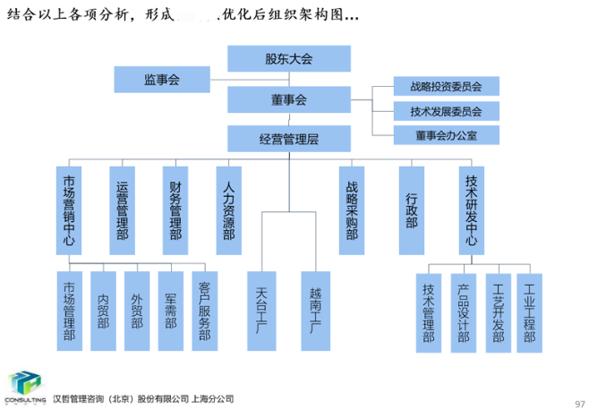 項目組從戰(zhàn)略意圖、價值鏈流程、組織功能分析、外部借鑒四個維度對公司的組織體系進(jìn)行了分析與優(yōu)化,提出了公司當(dāng)前的組織架構(gòu)優(yōu)化方案以及中長期組織架構(gòu)優(yōu)化與調(diào)整思路。
