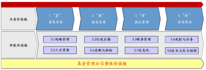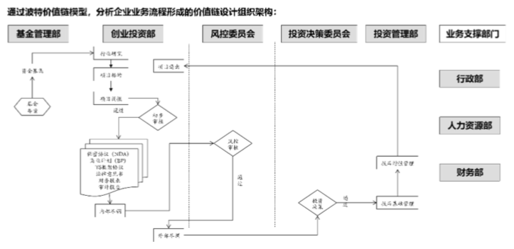 現(xiàn)代企業(yè)組織架構(gòu)設(shè)計(jì)的基石——流程管理,建立波特價(jià)值鏈模型,通過分析基金投資企業(yè)業(yè)務(wù)流程形成的價(jià)值鏈來設(shè)計(jì)企業(yè)組織架構(gòu)。邁克爾· 哈默:優(yōu)秀的流程將使成功的企業(yè)與其他競爭者區(qū)分開來,清晰的業(yè)務(wù)流程能理清組織架構(gòu)關(guān)系和理順信息流程,為架構(gòu)組織奠定基礎(chǔ)。