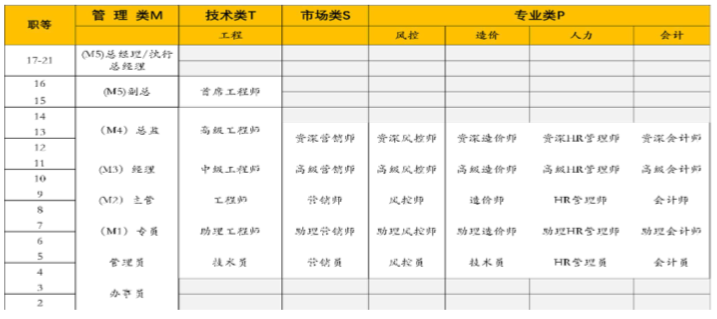 鑒于實(shí)業(yè)公司和實(shí)業(yè)公司發(fā)展基金目前發(fā)展階段的特點(diǎn),由咨詢顧問進(jìn)行崗位價(jià)值評(píng)價(jià),得到《職等架構(gòu)表》,職等架構(gòu)重點(diǎn)體現(xiàn)在基金業(yè)務(wù)和項(xiàng)目運(yùn)營管理業(yè)務(wù)上