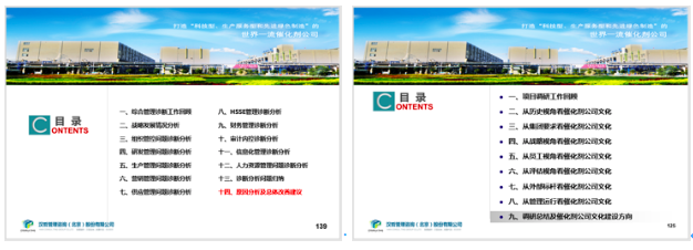 在深入調(diào)研、嚴(yán)謹(jǐn)分析基礎(chǔ)上,全面撰寫兩個《診斷報告》?!豆芾砭C合診斷報告》從戰(zhàn)略發(fā)展、組織管控、研發(fā)管理、生產(chǎn)管理、營銷管理、供應(yīng)管理、HSSE管理、財務(wù)管理、審計內(nèi)控、信息化管理、人力資源管理共計11個維度,對公司管理進行了綜合診斷。并結(jié)合公司發(fā)展現(xiàn)狀,和最佳管理實踐,針對性的提出49個具體管理問題,和8項綜合改進舉措?!段幕\斷報告》從歷史視角、集團要求、戰(zhàn)略視角、員工視角、評估視角、外部標(biāo)桿、管理運行7個方面對企業(yè)文化進行了全面的診斷分析。