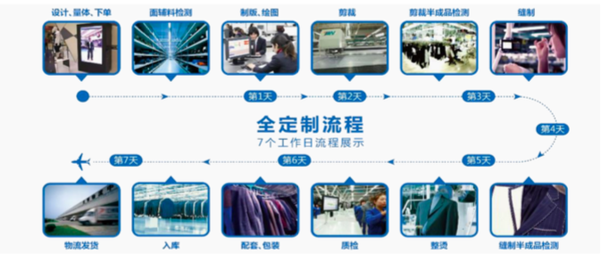 個性化定制服裝“從訂單到交付”的全流程管理蘊藏著酷特的核心競爭力??崽貍€性化定制服裝的標(biāo)準(zhǔn)生產(chǎn)時間為7個工作日,全流程藍(lán)圖如下:
