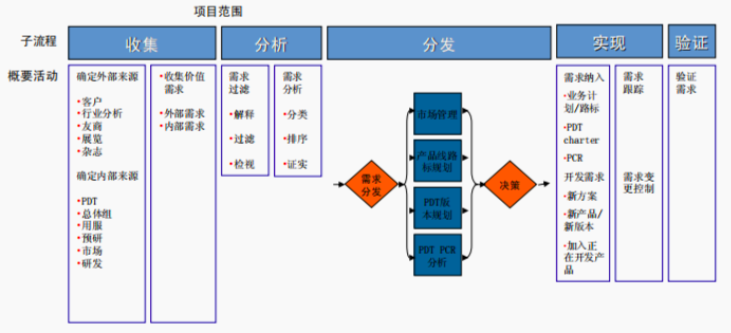 需求管理流程分為收集、分析、分配、實(shí)現(xiàn)和驗(yàn)證5個(gè)階段。其中需求收集、分析、分配主要在產(chǎn)品規(guī)劃、項(xiàng)目任務(wù)書(charter)開發(fā)在IPD流程的概念階段進(jìn)行,實(shí)現(xiàn)和驗(yàn)證階段流程主要在IPD產(chǎn)品開發(fā)流程中實(shí)現(xiàn)。