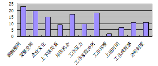 調(diào)研前,通過(guò)與人力資源部初步了解,S公司員工流失的原因是多方面的,既有公司的原因,也有員工自身的原因;有些原因是公司可控的,有些是無(wú)法控制的。因此,調(diào)研機(jī)構(gòu)把員工離職的原因定位于企業(yè)內(nèi)部,設(shè)計(jì)了主要包括薪酬福利、發(fā)展空間、企業(yè)文化、上下級(jí)關(guān)系、培訓(xùn)機(jī)會(huì)、工作壓力、工作家庭沖突、工作環(huán)境、上班時(shí)間、工作成就感、公司制度等十一項(xiàng)內(nèi)容的面談問(wèn)卷。在與離職員工面談溝通的過(guò)程中,通過(guò)善意的引導(dǎo),盡可能獲得離職人員的真實(shí)想法。同時(shí),調(diào)研機(jī)構(gòu)會(huì)詳細(xì)記錄面談的內(nèi)容,并對(duì)面談結(jié)果進(jìn)行了統(tǒng)計(jì)(見(jiàn)下圖)。