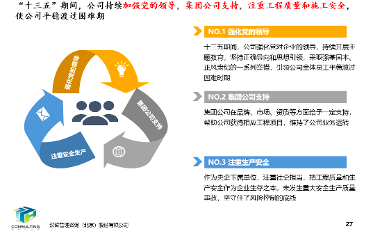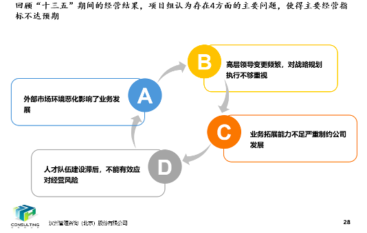 其中,“十三五”規(guī)劃實(shí)施情況評(píng)估,主要是針對(duì)客戶“十三五”規(guī)劃整體目標(biāo),分別進(jìn)行評(píng)價(jià),分析目標(biāo)達(dá)成或未達(dá)成原因,以及結(jié)合當(dāng)前內(nèi)外部環(huán)境,提出未來發(fā)展方向建議。