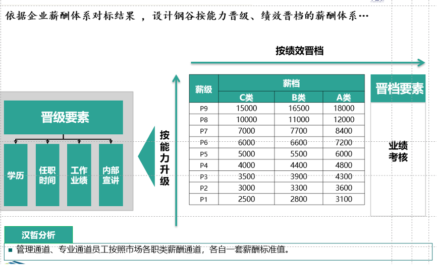1、對(duì)標(biāo)典型互聯(lián)網(wǎng)企業(yè)薪酬模式及薪酬結(jié)構(gòu)。研究分析阿里、騰訊、百度、華為四家公司的薪酬模式及薪酬結(jié)構(gòu),結(jié)合公司實(shí)際情況,對(duì)員工能力進(jìn)行評(píng)估,按照能力晉級(jí),績效進(jìn)檔的方式設(shè)計(jì)能力薪酬體系,構(gòu)建鋼谷公司自己特點(diǎn)的薪酬體系。