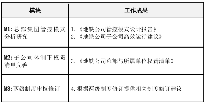 由于分改子之后,地鐵公司總部與所屬單位在公司治理結(jié)構(gòu)、管控模式與定位等方面進(jìn)行了調(diào)整,由此帶來總部與所屬單位在職責(zé)分工、權(quán)責(zé)劃分等方面也需要進(jìn)行同步調(diào)整,以便進(jìn)一步明確總部與所屬單位的權(quán)責(zé)界面,在此情形下,公司決定聘請(qǐng)外部機(jī)構(gòu)協(xié)助梳理總部與子公司的職責(zé)分工與權(quán)責(zé)邊界,促進(jìn)分改子體制改革扎實(shí)有效的落地。