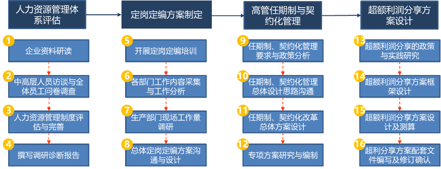 整體解決方案分為四個(gè)階段:人力資源管理體系評(píng)估、定崗定編方案制定、高管任期制與契約化管理、超額利潤(rùn)分享方案設(shè)計(jì)。如下圖: