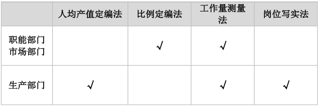 (2)比例定編法:是指通過(guò)設(shè)定不同類型人員的比例,在總量確定的基礎(chǔ)上,核定各類人員數(shù)量的方法。計(jì)算公式:部門(mén)/類型人員數(shù)量=該部門(mén)/類型人員比例×企業(yè)員工總數(shù)。其中:不同部門(mén)、類型人員比例通常運(yùn)用行業(yè)對(duì)標(biāo)、歷史數(shù)據(jù)分析、工作量測(cè)量等方式確定;