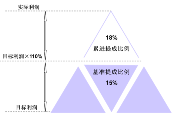 (2)確定超額利潤(rùn)提成額的計(jì)算公式:為充分激勵(lì)項(xiàng)目公司的骨干員工,提成比例分為“基準(zhǔn)提成比例”和“累進(jìn)提成比例”,分別針對(duì)不同超額部分設(shè)定,如下圖: