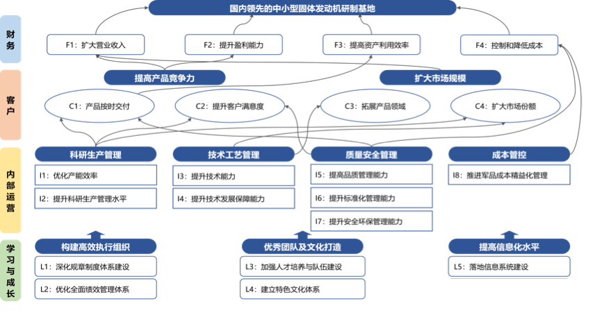 研究所制定《十四五發(fā)展規(guī)劃》,明確發(fā)展目標(biāo)和重點(diǎn)方向,保障戰(zhàn)略目標(biāo)的有效執(zhí)行是重點(diǎn),根據(jù)研究所的總體戰(zhàn)略目標(biāo),借助平衡計(jì)分卡,從財(cái)務(wù)、客戶、內(nèi)部運(yùn)營、學(xué)習(xí)與成長四個方面對戰(zhàn)略目標(biāo)進(jìn)行逐層分解,形成若干戰(zhàn)略主題,通過各部門梳理和討論,最終確定研究所戰(zhàn)略地圖。