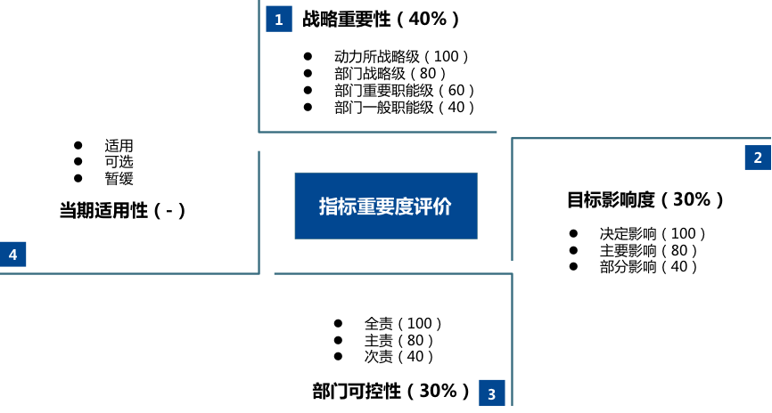 從戰(zhàn)略重要性、目標(biāo)影響度、部門可控性、當(dāng)期適用性四個維度建立指標(biāo)評價(jià)模型,由考核工作小組對各部門績效指標(biāo)進(jìn)行初次評價(jià),各部門負(fù)責(zé)人進(jìn)行復(fù)評,選取評分排名靠前的指標(biāo)作為當(dāng)期部門績效考核指標(biāo),最終由考核領(lǐng)導(dǎo)小組審核確認(rèn)入選指標(biāo)。入選指標(biāo)每年由考核工作小組根據(jù)當(dāng)年實(shí)際工作進(jìn)行動態(tài)更新,如研究所戰(zhàn)略或工作目標(biāo)發(fā)生調(diào)整,則需重新進(jìn)行指標(biāo)評價(jià)。