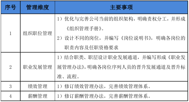 根據(jù)調(diào)研,本次績效薪酬體系優(yōu)化工作主要集中在組織職位體系梳理、職業(yè)發(fā)展通道設(shè)計、薪酬結(jié)構(gòu)優(yōu)化、考核模式與指標(biāo)體系優(yōu)化等方面。
