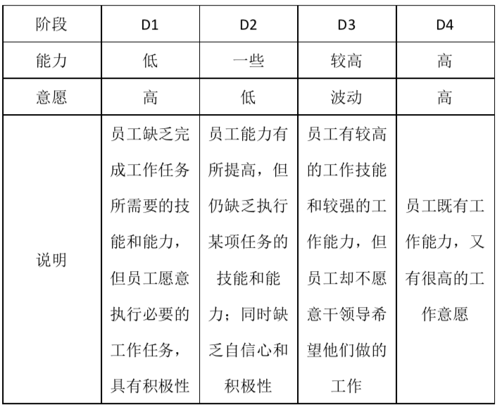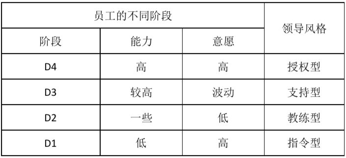 D4階段一般是員工入職3年以上,工作能力強,能獨立開展某項工作,而且工作意愿強,特別想獨立開展工作。這個階段適于采用授權(quán)型的領(lǐng)導(dǎo)風格,低指揮、低支持,充分授權(quán)給予發(fā)揮的空間。