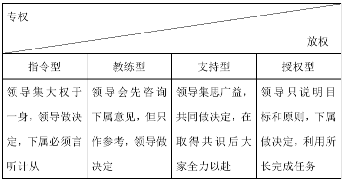 第一種為指令型領(lǐng)導(dǎo),對員工的角色和目標給予詳盡的指導(dǎo),并密切監(jiān)督任務(wù)完成情況。