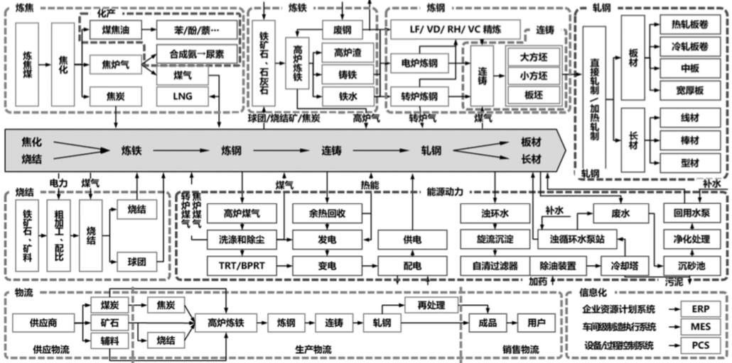 一、開展工藝流程梳理分析。不同的鋼鐵企業(yè)具有多種業(yè)務(wù),一些只到煉鐵,一些只從軋制開始。因此,各業(yè)務(wù)間的配合,包括前端產(chǎn)品與后端產(chǎn)品的匹配等,是分析鋼企工藝流程的關(guān)鍵要素。筆者所咨詢的鋼企,由10個業(yè)務(wù)板塊構(gòu)成的涵蓋全產(chǎn)業(yè)鏈的煉鋼企業(yè)。其工藝流程分析結(jié)果如下圖所示: