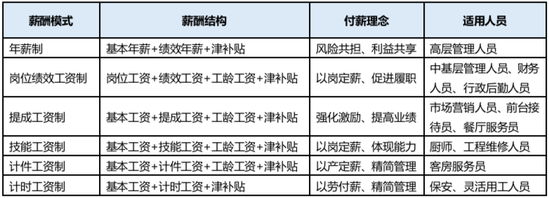 酒店行業(yè)崗位類(lèi)型復(fù)雜、激勵(lì)導(dǎo)向不同,設(shè)計(jì)薪酬時(shí),也應(yīng)該結(jié)合各類(lèi)崗位特征、管理要求選擇適當(dāng)?shù)男匠昴J胶徒Y(jié)構(gòu)。常見(jiàn)薪酬模式包括年薪制、崗位績(jī)效工資制、提成工資制、技能工資制、計(jì)時(shí)/計(jì)件工資制等。