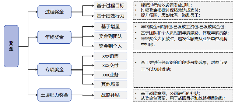 專項獎金是根據(jù)年度戰(zhàn)略性的重點工作設(shè)置的專項激勵,一般考慮設(shè)置定額激勵,掛鉤績效結(jié)果,或重點工作業(yè)績目標(biāo)完成的一定比例分享,或?qū)m楉椖抗ぷ?,可根?jù)項目階段節(jié)點設(shè)置定額獎金/項目整體獎金的一定比例作為項目節(jié)點完成獎金,及時激勵。