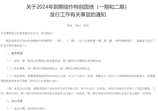 8月19日,財(cái)政部發(fā)布關(guān)于2024年到期續(xù)作特別國債發(fā)行工作有關(guān)事宜的通知。財(cái)政部擬發(fā)行2024年到期續(xù)作特別國債(一期)、(二期)。第一期為10年期固定利率附息債,第二期為15年期固定利率附息債。第一期發(fā)行面值3000億元,第二期發(fā)行面值1000億元。兩期國債票面利率均為發(fā)行日前一至五個(gè)工作日(含第一和第五個(gè)工作日)中國國債收益率曲線中,同期限國債收益率算術(shù)平均值(四舍五入計(jì)算到0.01%)。發(fā)行日期為2024年8月29日,在全國銀行間債券市場面向境內(nèi)有關(guān)銀行定向發(fā)行,中國人民銀行將面向有關(guān)銀行開展公開市場操作。