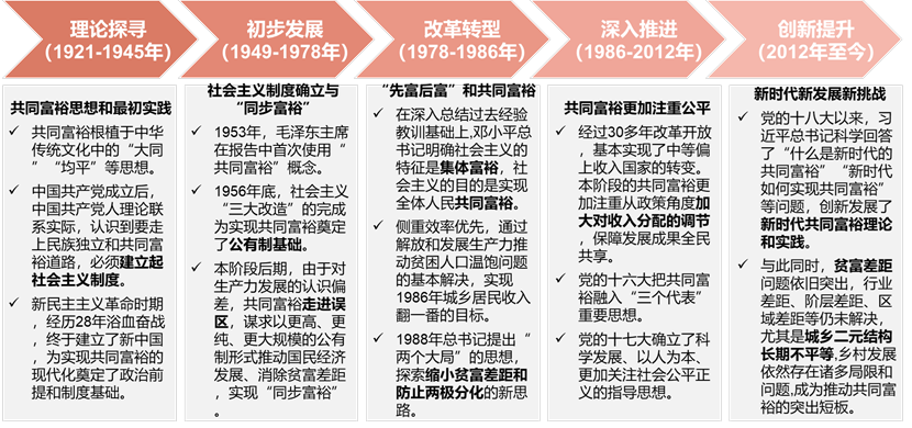 共同富裕作為社會(huì)主義的本質(zhì)要求,是中國(guó)式現(xiàn)代化的重要特征,其演進(jìn)史反映了中國(guó)共產(chǎn)黨百年奮斗的重要使命貫穿中國(guó)共產(chǎn)黨百年奮斗歷程,呈現(xiàn)出“理論探尋—制度奠基—改革突破—深化完善—創(chuàng)新提升”的清晰脈絡(luò)(見圖18)。。