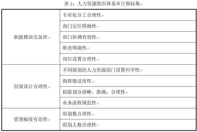 每一種人力資源組織體系都是在特定的外部環(huán)境影響下產(chǎn)生的,組織形態(tài)本身并不存在優(yōu)劣之分,適合的,才是最好的。由此,從審計(jì)的角度,我們需要三個(gè)方面,一是職能模塊的完備性,二是層次設(shè)計(jì)的合理性,三是管理幅度的有效性。結(jié)合前文分析,我們建立了有關(guān)于人力資源組織體系的審計(jì)指標(biāo)集,如下表所示: