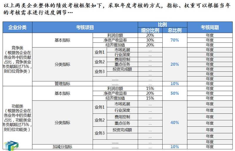 1、優(yōu)化集團(tuán)所屬子公司經(jīng)營業(yè)績考核辦法。根據(jù)集團(tuán)戰(zhàn)略目標(biāo)和所屬子公司的功能定位、業(yè)務(wù)特點,實行年度考核與任期考核相結(jié)合的方式,遵循依法考核、激勵與約束并重、分類考核的原則,制定子公司考核指標(biāo)、考核程序、考核計分辦法,形成所屬子公司的經(jīng)營業(yè)績考核辦法,保護(hù)投資人的合法權(quán)益,落實資產(chǎn)保值增值責(zé)任,建立有效的激勵和約束機制,為實現(xiàn)集團(tuán)戰(zhàn)略目標(biāo)夯實堅實的基礎(chǔ)。