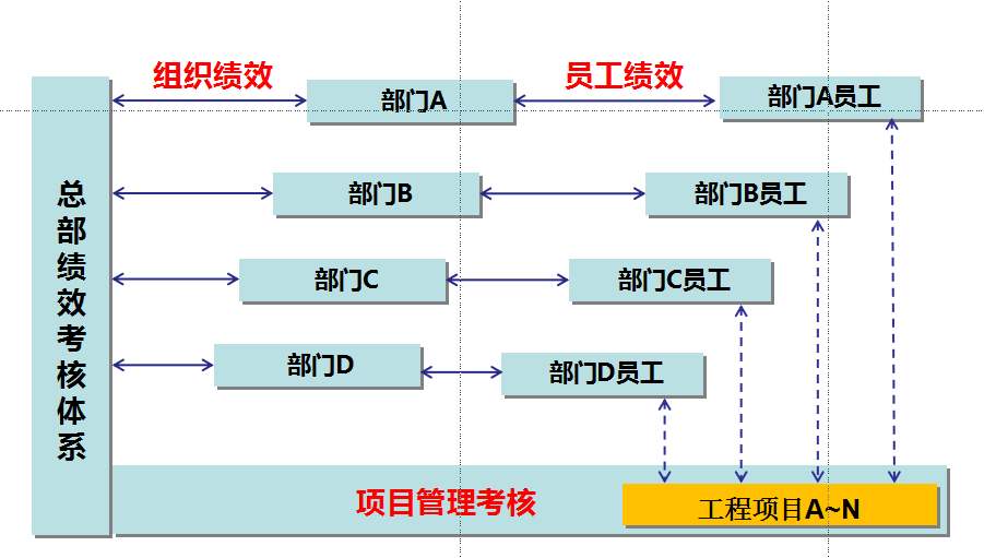 根據(jù)診斷中發(fā)現(xiàn)的問(wèn)題,我們把績(jī)效考核分為三個(gè)層次,分別是部門級(jí)考核、員工級(jí)考核和項(xiàng)目管理考核;部門考核基于公司的戰(zhàn)略目標(biāo),層層分解,直到分解到每個(gè)部門需承擔(dān)的責(zé)任,抽象為績(jī)效考核指標(biāo);員工考核基于公司分解到部門的指標(biāo)承接及本崗位職責(zé)的指標(biāo)提取。項(xiàng)目管理考核按項(xiàng)目管理四維度進(jìn)行展開,充分體現(xiàn)項(xiàng)目管理特點(diǎn)及重要性。