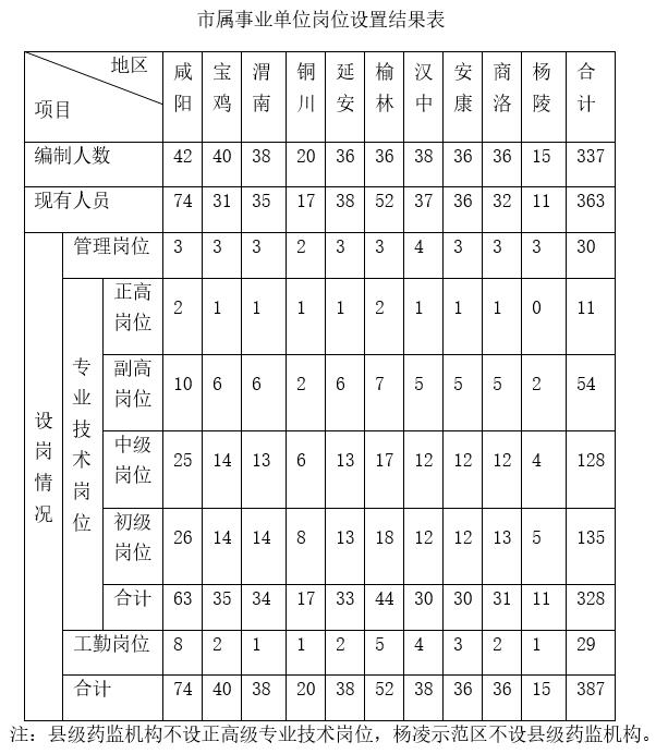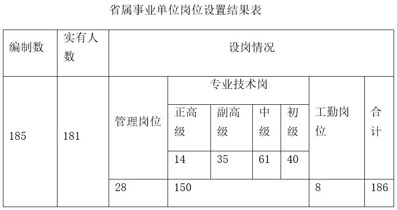 藥監(jiān)系統(tǒng)的事業(yè)單位崗位設(shè)置工作,歷時半年,全部完成崗位設(shè)置和審批工作,主要結(jié)果如下:96個事業(yè)單位中,除省屬信息培訓(xùn)中心外,全部確認(rèn)為以專業(yè)技術(shù)人員為主體,管理崗位和工勤技能崗位為輔。全系統(tǒng)共設(shè)崗1252個,其中管理崗位89個,專業(yè)技術(shù)崗位1048個,工勤技能崗位115個。省、市、縣三級藥監(jiān)機(jī)構(gòu)各類崗位具體分布情況見下表: