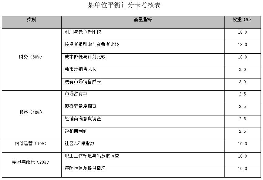 平衡計(jì)分卡是卡普蘭和諾頓在總結(jié)了十二家大型單位的業(yè)績(jī)?cè)u(píng)價(jià)體系的成功經(jīng)驗(yàn)的基礎(chǔ)上提出的。平衡計(jì)分卡是一種戰(zhàn)略性人力資源管理思想和指導(dǎo)方法。平衡計(jì)分卡的倡導(dǎo)者認(rèn)為在制定單位發(fā)展戰(zhàn)略目標(biāo)時(shí),不能只考慮財(cái)務(wù)指標(biāo),而應(yīng)該考慮支撐單位財(cái)務(wù)指標(biāo)實(shí)現(xiàn)的其他方面:關(guān)注客戶(hù)、業(yè)務(wù)流程、學(xué)習(xí)與成長(zhǎng)等。由此,平衡計(jì)分卡考核指標(biāo)可以從多個(gè)維度構(gòu)建,但是較為普遍的是從財(cái)務(wù)維度、客戶(hù)維度、內(nèi)部流程維度、學(xué)習(xí)和創(chuàng)新維度進(jìn)行考慮。