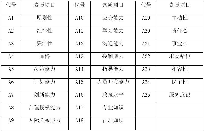 最后,內(nèi)外部專家通過焦點(diǎn)小組討論的方法,逐一對(duì)行為事件訪談收集的有關(guān)局級(jí)領(lǐng)導(dǎo)干部素質(zhì)的基本陳述進(jìn)行初步歸納、總結(jié)與分類,初選出25個(gè)素質(zhì)要項(xiàng),見表如下: