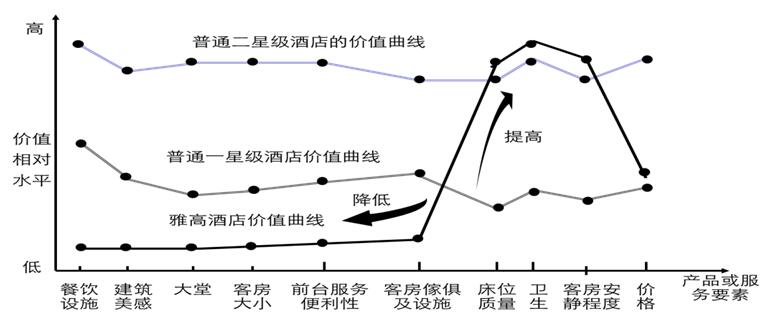 為了創(chuàng)造出這種“獨(dú)特的價值”,雅高的專家們將酒店業(yè)的主要競爭“產(chǎn)業(yè)元素”全部列出來,比如“餐飲質(zhì)量”、“建筑美感”、“大堂”、“客房大小”、“前臺服務(wù)便利性”、“客房家具設(shè)施”、“床位質(zhì)量”、“衛(wèi)生”、“客房安靜程度”,還有“價格”。它們把這些要素放在坐標(biāo)橫軸上,然后,根據(jù)它們對顧客的價值畫出一條線,就是“價值曲線”,如下圖所示: